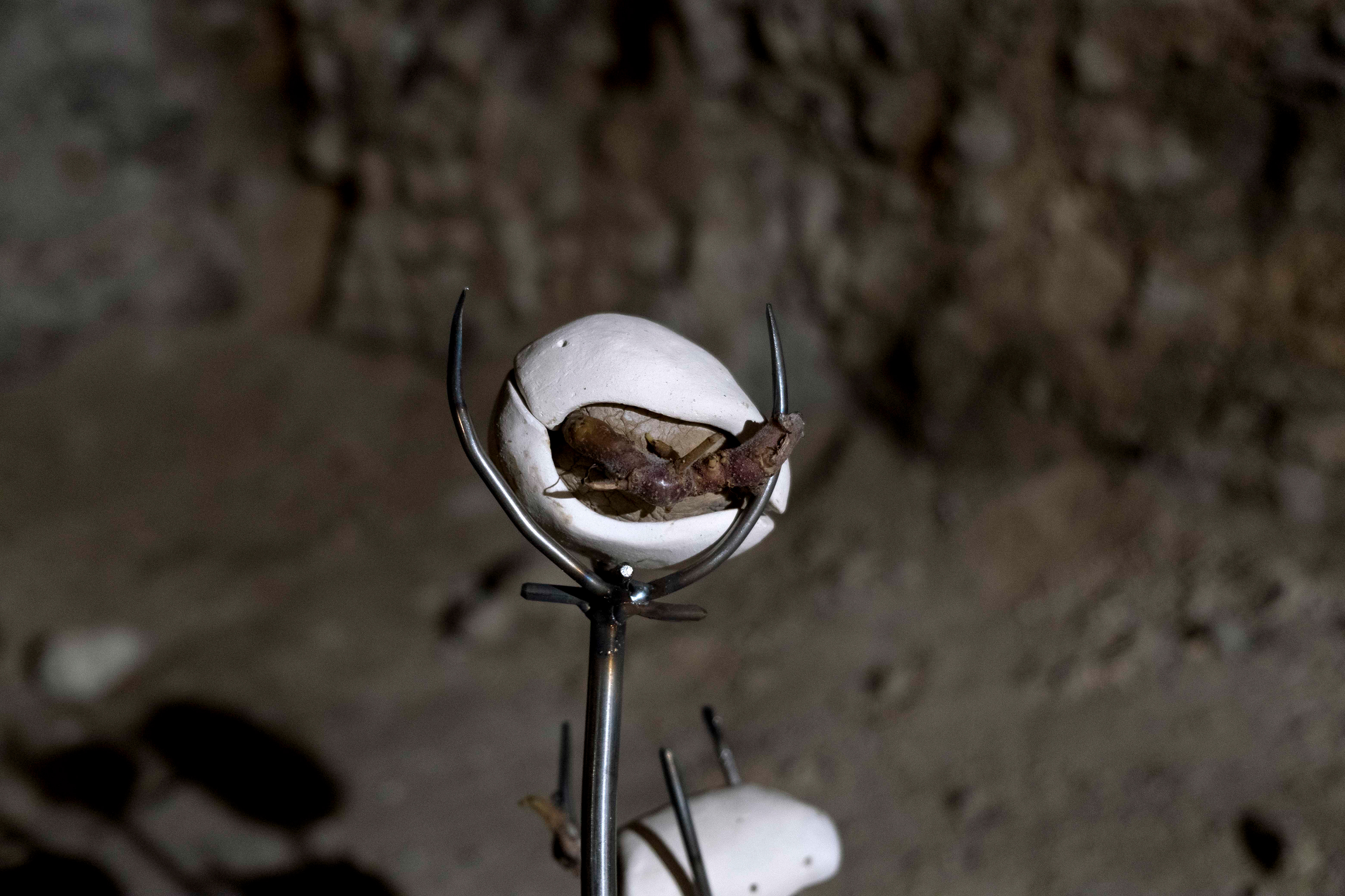 The metal structure, like a musical score, echoes the root system, which tends to spread and grow randomly. The work of the terra was to envelop these tubers, as if to protect them as they sprouted. Raising them through sculpture gives them a mysterious presence in space, and calls to mind the goddess of the potato in Inca mythology, Axomama.